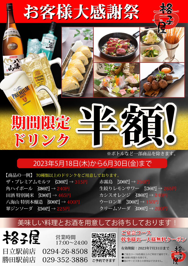 2店舗合同ドリンク半額!